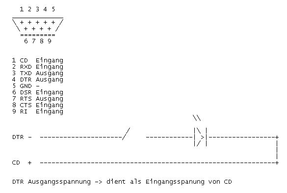 es ist schon trivial, allerdings sind doch ein paar Kleinigkeiten zu beachten. Frei verwendbar sind 2 Ausgänge (RTS und DTR) sowie 4 Eingänge (CTS,DSR,DCD und RI). Diese Bits sind über die Statusregister der UART erreichbar, wie die unter Linux angesprochen werden - keine Ahnung. Und dann gibts da noch die physikalischen Schnittstellenparameter, ein 1-Pegel ist mit -3..15V, ein 0-Pegel mit+3..15V definiert. Wie sich ein offener Eingang oder ein mit Masse verbundener hält, kann bei jedem PC anders sein, kommt auf die verbauten Treiberchips an. Und um die Sache nun auf den Punkt zu bringen: die Leitung TxD führt, wenn keine Daten gesendet werden, 1-Pegel. Diesen Ausgang über einen Widerstand 10k mit z.B. CTS verbinden, per Software den Ausgang RTS auf + setzen und den Schalter dann zwischen RTS und CTS verschalten.