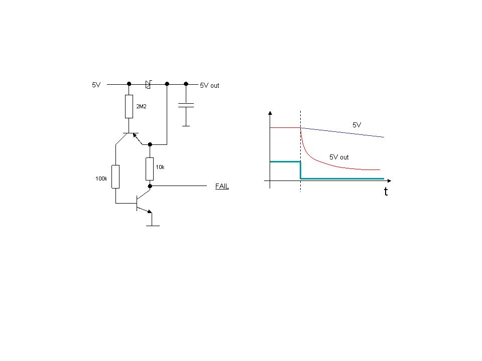 Deine Schaltung zweifle ich an. Zumindest den Diagrammverlauf. 5Vout sinkt schneller als 5V, das ist ja wohl nicht so ganz korrekt. Die Schaltung ist auch nicht der Hit. Sie verbraucht für das Fail-Signal aus den 5Vout Strom und somit Ladung. Was soll das denn?