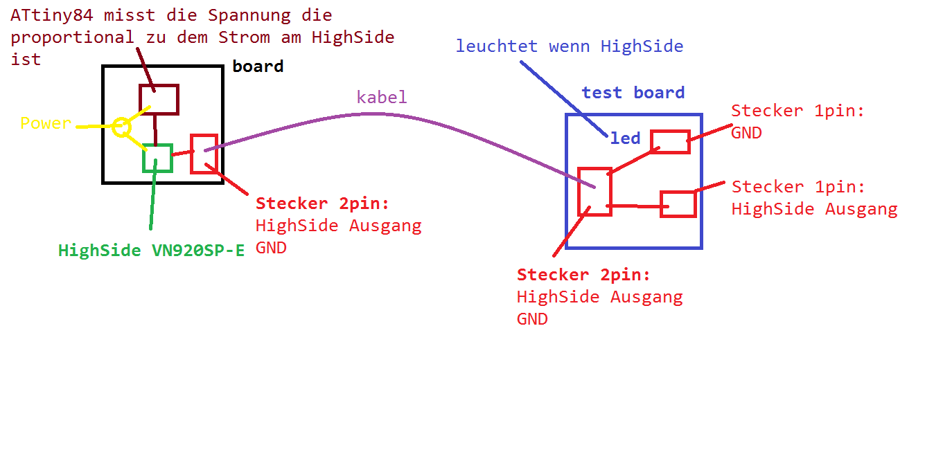 HighSide was? Ein HighSide Switch? Wenn ich solche farbigen Klötzchen im Kopf hätte, wüsste ich auch nicht wo ich was anschließen muss. Bitte transformiere das ganze doch mal in einen vereinfachten Schaltplan, so daß man genau erkennt wo die Stromversorgung, Schalter und Last sind. Ich denke dann wird das klarer.