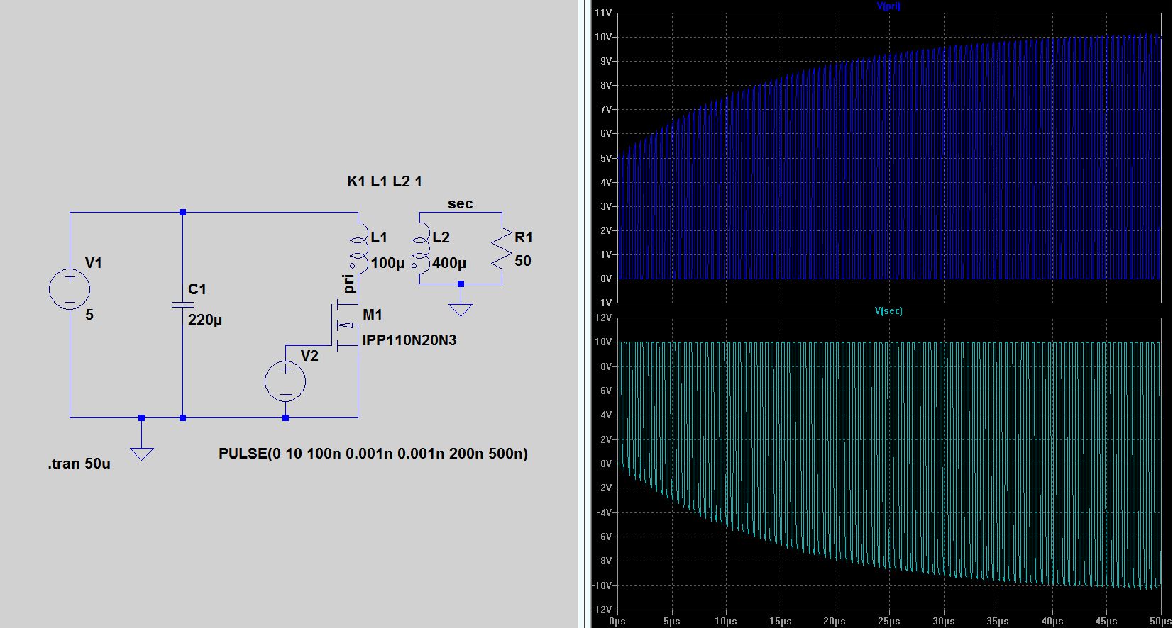 Also bei mir macht es nicht was es soll, siehe Anhang (Vsek ist dabei die Spannung an der Primärspule). Meiner Meinung nach, sollte an der Spule ein pulsierendes Signal zwischen 5V (-> Spannungsversorung V1) und 0 Null geben. Dieses soll dann im Verhältnis 1:4 auf die Sekundärspule übertragen werden. Also erwarte ich dort dasselbe Rechtecksignal, aber nun mit einer Amplitude von 20V (4*Ul1).