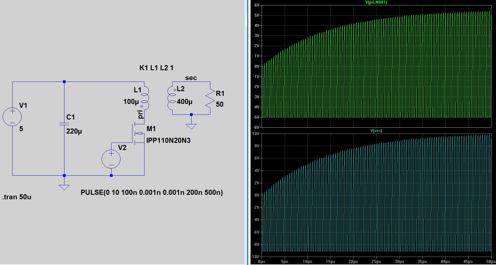 Wie soll eine Spule (Trafo) Energie übertragen, wenn du keine reinsteckst? Lass mal primär Strom fließen, schalt dann ab. Beide Zeiten, an und ab nicht zu kurz, 100 nsec ist ein schlechter Witz! Zeiten drunter nimm ich gar nicht ernst.