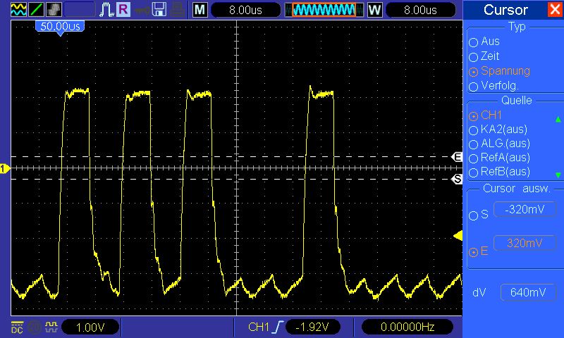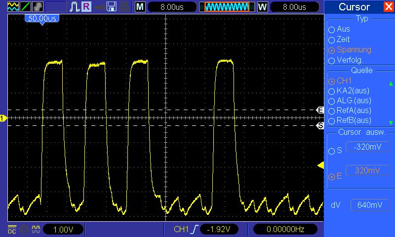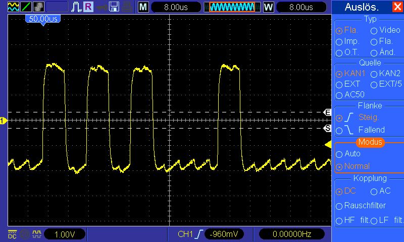 Bei genauer Suche habe ich doch noch ein längeres Kabel gefunden: ca. 90-95 m 4x0,25 + Schirm. Die Adern sind - glaube ich - nicht verdrillt; auf Verdacht habe ich weiß/braun verwendet. Der Lastwiderstand am Ende hat 120 Ohm und abgesehen vom Spannungsabfall am Kabel ist das Signal besser als mit rein kapazitiver Last zuvor. Ein weiteres Bild mit angeschlossenem Schirm zeigt leicht abgeflachte Flanken; das ist aber kein Grund, auf den Schirm zu verzichten. Felix A. schrieb: > Ein Versuch mit > RS232 über 100m ist also kein Komplettverlust... So ist es. Brauchst Du vielleicht Kabel 90-95 m, 4x0,25 mm² mit Schirm von Unitronic bleifrei? ;-)