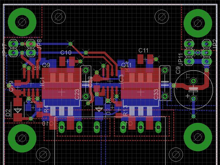 Boris O. schrieb: > Ist es ein Wärme- oder ein Spannungsproblem? Bei 75kHz sind ein > paar > Millimeter Leiterkarte noch keine rasante Induktivität. Der > Treiberbaustein ist auch dafür gemacht, zu treiben. Aber Wärme muss auch > adäquat abgeführt werden. Die Außentemperatur (am Gehäuse/ auf der > Leiterkarte) ist ja nur nach dem thermischen Widerstand. Davor liegt das > Silizium und das ist deutlich wärmer. Es genügt auch, wenn es zu schnell > zu warm wird. Ein paar Strommmessungen, gerade um die Totzeit sicher als > ausreichend anzuerkennen, sind nicht verkehrt. > > Erkenne ich es recht, dass Gate-Anschlüsse über Durchkontaktierungen und > Ebenenwechsel gemacht werden? Vermeide ich grundsätzlich. Ansonsten: > Strompfade einzeichnen und Schleifengröße reduzieren. (Schaltverhalten > messen.) Die wärme war bisher nicht so sehr das Problem. Es bewegt sich irgendwo bei 35-45°C. Es ist eher die Spannung, die viel zu gering ist, weil der Konstanter in die Strombegrenzung geht (1A, ohne Last an der Vollbrücke). Ich frage mich wo die 1A verbraten werden, weil ich mit der Wärmebildkamera nichts sehen kann, was zu warm wird. Der Konstanter ist ein EA-PS 8200-70 200V 70A 5000W.