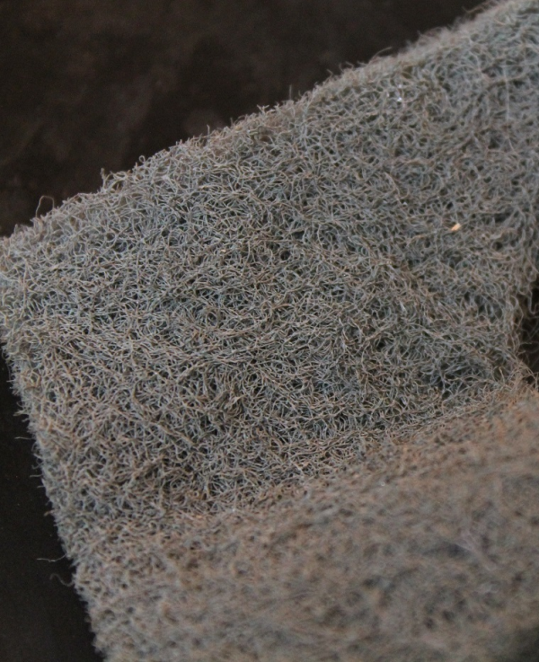 Das Zeug am Haushaltsschwamm ist in neuem Zustand ziemlich agressiv (damit kann man z.B. Fensterglas zerkratzen), nutzt sich aber recht flink ab. Etwas moderater in der Wirkung, dafür aber länger haltbar ist das Schleifvlies, was im Baumarkt da zu finden ist, wo das Lötzubehör für das Löten von Heizungs- oder Wasserrohren herumliegt.