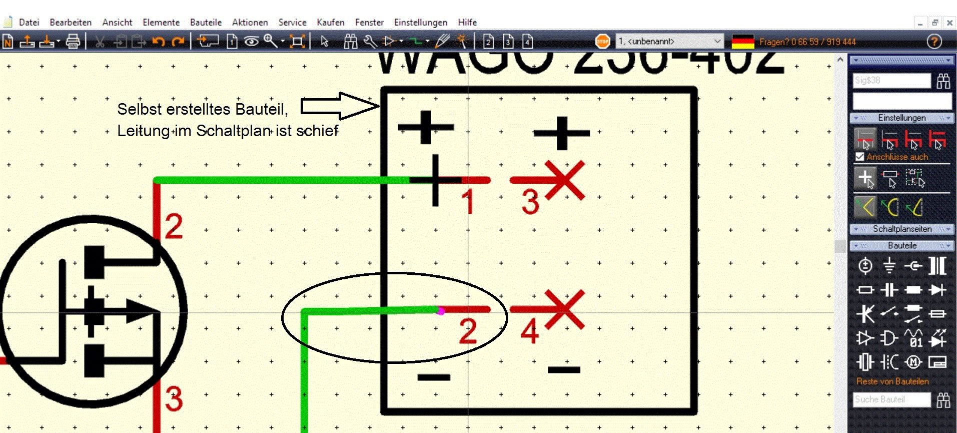 Die schiefe Leiterbahn bekommst du nur weg indem du das Symbol bearbeitest. Erstelle ein neues Projekt Schaltplan. Das Symbol in der Mitte platzieren und vergrößern. Die Pins 2 und 4 löschen und neu setzen. Tipp: Setze die Pins immer auf einen Rasterpunkt um die schiefe Leiterbahn zu verhindern. Gruss Andy