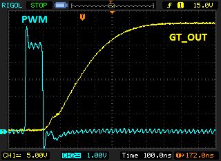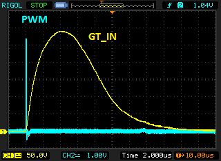 @Maxim S. (maxim) Benutzerseite >Also ich habe nun alles außer Q1 und Q2 entfernt und zwischen PWM und >GT_IN einen 100 Ohm Widerstand eingesetzt (siehe >Beitrag "Re: PWM-Auflösung im untersten Bereich verbessern"). Man könnte sogar direkt mit dem AVR ansteuern, der ist besser als sein Ruf. Beitrag "Re: Transistor, 1A, 4MHz Schaltfrequenz" >Der >Stromimpuls >durch die LED (gemessen an einem 1 Ohm Shunt) Wo und wie gemessen? >kommt nun an 50 ns heran >(wenn das PWM-Signal ebenfalls 50 ns breit ist)! Es gibt zwar noch kurze >Nachschwinger, aber das ist nebensächlich. Die LED kann nun so dunkel >gedimmt werden, dass sie nicht mehr wahrnehmbar ist. HEUREKA! >Da der BUZ11 bei 5V GS-Spannung aber nicht voll durchschaltet, erwärmt >er sich bei 100% PWM stark. Da wird demnächst ein Ersatz bestellt. IRLZ34N ist der Klassiker. >Ich habe nun noch eine Frage zur Stabilität der Schaltung: Wie bekomme >ich die hochfrequenten Spannungsschwankungen von der 5V-Schiene des uCs >weg? Elkos und Keramikkondensatoren nahe uC sind ja selbstverständlich. Wie und wo hast du gemessen? Bilder? Wie sieht dein Aufbau im Moment aus? Oft sind es auch Meßfehler.