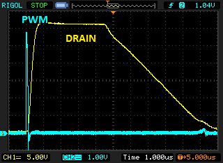 @ Konrad S. (maybee) >Die On-Zeit deines BUZ11 ist also ca. 8µs, d.h. 64 Takte (8MHz Clock >angenommen) lang, anstatt 1 Takt. Hier musst du ansetzen. Mit dem BUZ11 >wirst du das Ziel nicht erreichen können, der ist zu langsam. Quark. Der BUZ11 ist allemal schnell genug, WENN er knackig am Gate angesteuert wird! Turn on time, delay, etc, liegt alles unter 100ns. OK, ein sauberer 100ns Puls könnte schwierig werden. A und O ist ein gescheiter MOSFET-Treiber ala ICL7667. Siehe MOSFET-Übersicht. Der selbstgestrickte Treiber ist in vieler Hinsicht Murks. Der Schaltplan des OP ist aber wie so oft nicht original, denn als Last sind sicher NICHT 10 Ohm drin sondern der LED-Cluster + Vorwiderstand (hoffe ich mal) Und die SPANNUNG ist nebensächlich, denn die ist wegen der LED-Kennlinie und parasitären Kapazität eher vermurkst, wenn man am Drain vom MOSFET misst. Entscheidend ist der STROM durch die LED bzw den MOSFET, der macht das Licht bzw. Dunkelheit. Optimal misst man mittels Shunt und Differenztastkopf in Reihe zur LED, zur Not reicht auch ein normaler Tastkopf.