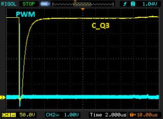 Falk B. schrieb: > Der BUZ11 ist allemal schnell genug, WENN er knackig am > Gate angesteuert wird! Turn on time, delay, etc, liegt > alles unter 100ns. Lies mal weiter im Datenblatt: turn-off-delay typ. 180ns; fall time typ. 130ns. > OK, ein sauberer 100ns Puls könnte schwierig werden. Das möchte ich doch meinen. Gate-Kapazität typ. 1.5 nF; Miller-Effekt auch nicht vergessen. Da ist man schnell mit 1 A Gatestrom für 100 ns dabei. Andererseits sind die 100 ns ohnehin ein akademischer Furz: Knapp 250 Hz PWM-Frequenz sind maximal 4 ms Einschaltdauer. Die (geschätzt) 4 µs, die jetzt lt. Ozillogramm erreicht werden, ermöglichen also 10 bit (!) Auflösung. Wenn es gelingt, die minimale Einschaltdauer auf 0.5 µs zu drücken, ergibt das schon 13 bit - das sind 8192 Stufen gegen bisher 1024.