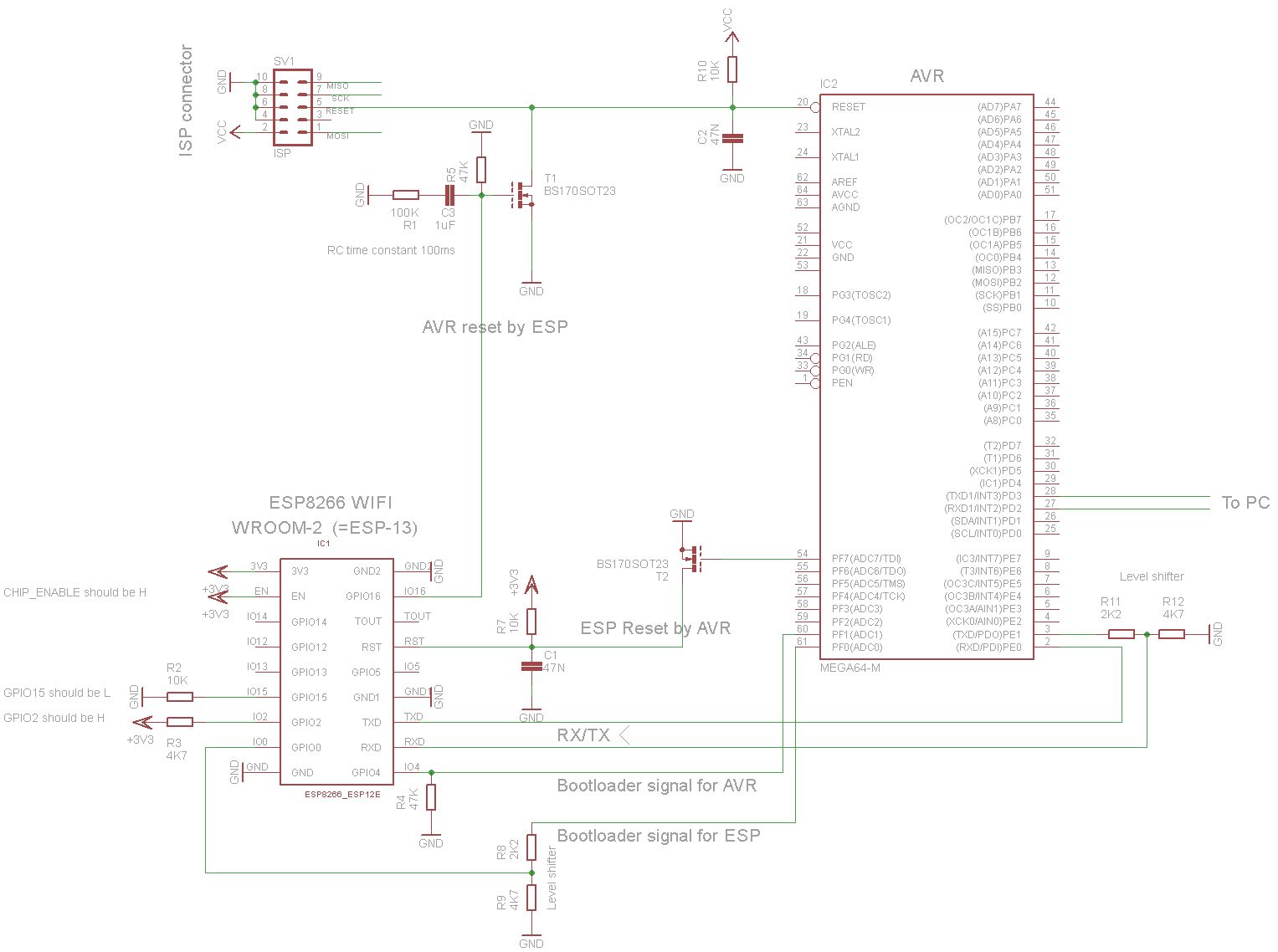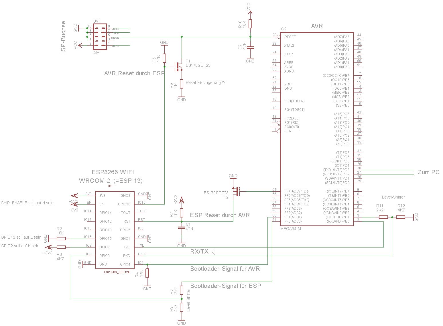Habe Fragen für ein geplanes Projekt mit AVR und ESP8266. AVR für Timing-kritisches. Externe Interfaces: ISP + UART des AVR (Nutzung nur während Entwicklung, da 230V-Platine). Chips sollen sich gegenseitig flashen können, d.h. resetten + Bootloader starten [1]. Teilschaltplan im Bild. a - Was passiert auf GPIOs des ESP beim Einschalten mit AT-Firmware? Habe von kurzen Signalen auf GPIO0 und GPIO2 gehört. Ist auf den anderen GPIO Ruhe, so dass sie meine AVR-Reset/-Bootloader-Leitungen werden können (im Plan GPIO 4/16)? b - Verzögerung für Reset-Signal vom ESP: Wie kann man erreichen, dass erst nach 100-500ms Signal der Reset-Pegel am AVR erreicht ist? Ich habe im Plan dafür R6 eingezeichet und einen Wert geraten. c - Noise: Ist die typische AVR-Resetbeschaltung (47N+10K) für den ESP geeignet? Meine Reset-Leitungen könnten 100mm lang werden, es gibt darüber ein Schaltnetzteil. d - Laut Hardware User Guide (http://akizukidenshi.com/download/ds/espressifsystems/0B-ESP8266__Hardware_User_Guide__EN_v1.1.pdf) sollten GPIO2 und GPIO15 auf H/L liegen. Dort steht auch, dass interne Pull-Ups das erledigen, so dass meine R2/R3 überflüssig wären. Gleichzeitig zeigen Beispielschaltungen dort Pull-Ups/Downs...?? e - Reicht für die RX-TX-Verbindug ein Spannungsteiler statt Level-Shifter-Chip zuverlässig für hohe Baudraten (115200 Baud)? f - Macht es bezüglich der ESP-Ausgänge oder sonstwie einen Unterschied, ob man für Resets den Enable-Pin oder den Reset-Pin verwendet (sind die Pegel im Reset- bzw. Disabled-Zustand identisch, vmtl. von externen Pull-Ups/Downs bestimmt)? g - Reicht zum Programmier-Start des ESP ein Reset und GPIO0=LOW (alternativ Chip-Enable-AUS-AN) oder muss man das ESP-Modul vom Strom trennen? h - Macht es einen Unterschied, ob man die Platine hinter der Antenne des ESP nur von Leiterbahnen freihält oder wegfräsen lässt? Würde nichts extra kosten. --- 1: o Müssen den Bootloader des anderen Chips durch Reset + Signal starten können (Reset des AVR durch ESP, Reset des ESP durch AVR) - Anfangs (während Entwicklung): o ESP mit Standard-AT-Firmware o Programmieren des AVR (Bootloade + Firmware) per ISP o Programmieren des ESP in Schaltung per PC über den Umweg AVR: - AVR-Firmware bringt ESP im Programmier-Modus (Reset + GPIO auf 0) - AVR-Firmware verbindet sich mit PC (1. UART) und ESP (2. UART) und verbindet beide in Software, so als ob der PC am ESP hängen würde (erspart Herausführen der ESP-Signale). - PC via AVR flasht ESP mit den üblichen Tools für COM-Ports - Später (in Anwendung): Keine Kabelverbindung erlaubt, da 230V-Platine. Alternative ESP-Firmware soll per Wifi Upgrades von ESP und AVR im Intranet durchführen können. Dazu wird es einen Bootloader im AVR geben, den der ESP per Reset jederzeit starten kann.