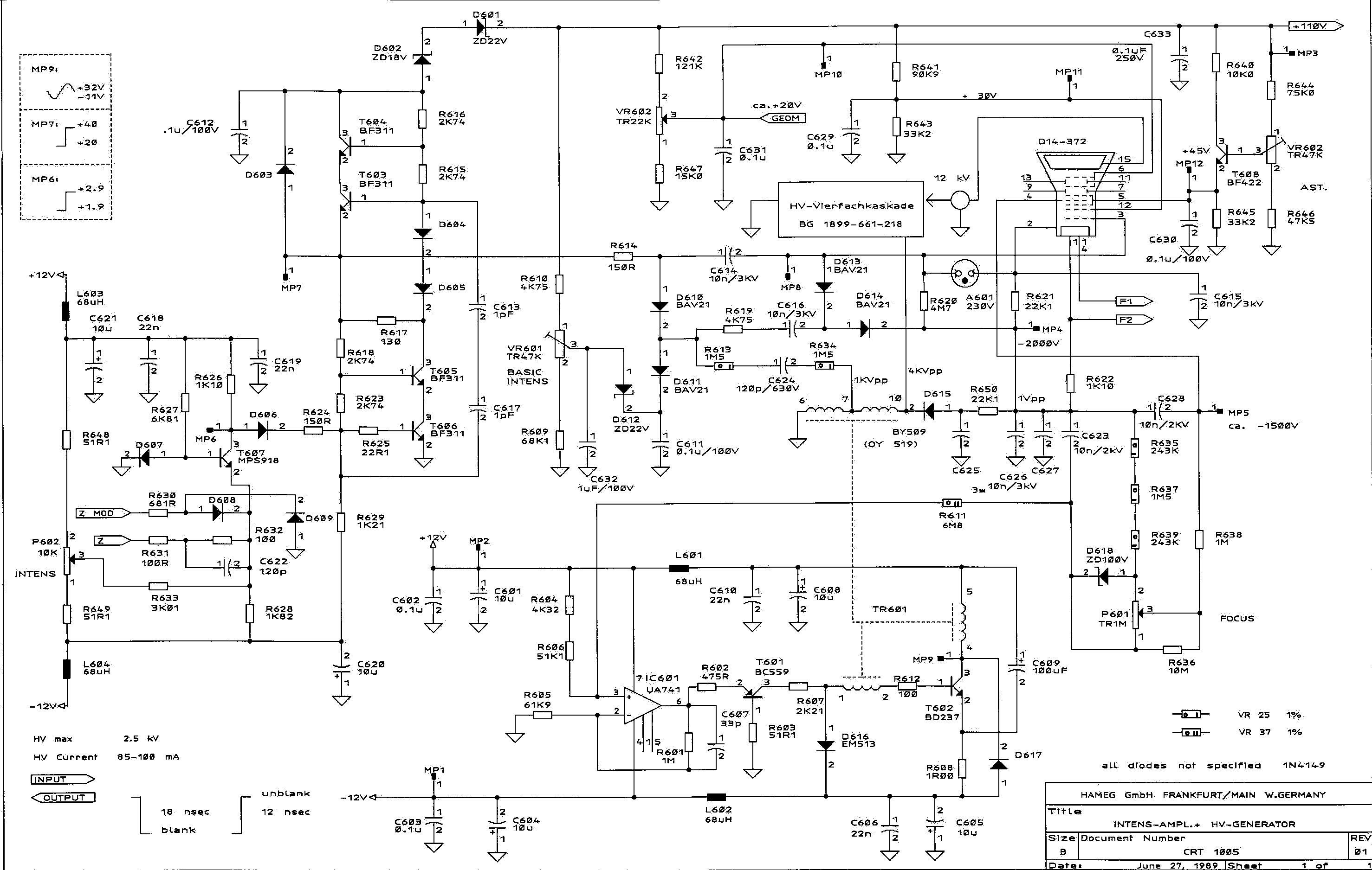 Die Spannungen 110V, 45V und ca.22v stimmen so weit. Der Regelbereich von P602 links außen ist i.O.. Alle Halbleiter habe ich soweit mit Durchgangstester gemessen, nichts auffälliges. Elkos habe ich komplett vor ca. 2 Jahren schon mal getauscht, egal ob gut oder schlecht. Die Kathode liegt auf -2kV, soweit will ich noch gar nicht gehen. Ich möchte nur vorerst die Röhre dunkel haben um in Ruhe messen zu können. Wenn ich nur den Stecker vom Sockel abziehe vermute ich das mir Spannungen hochgehen wegen der fehlenden Belastung, ich will die Kaskade aus der die 12kV und 4kV kommen nicht riskieren. m.f.G. Dirk