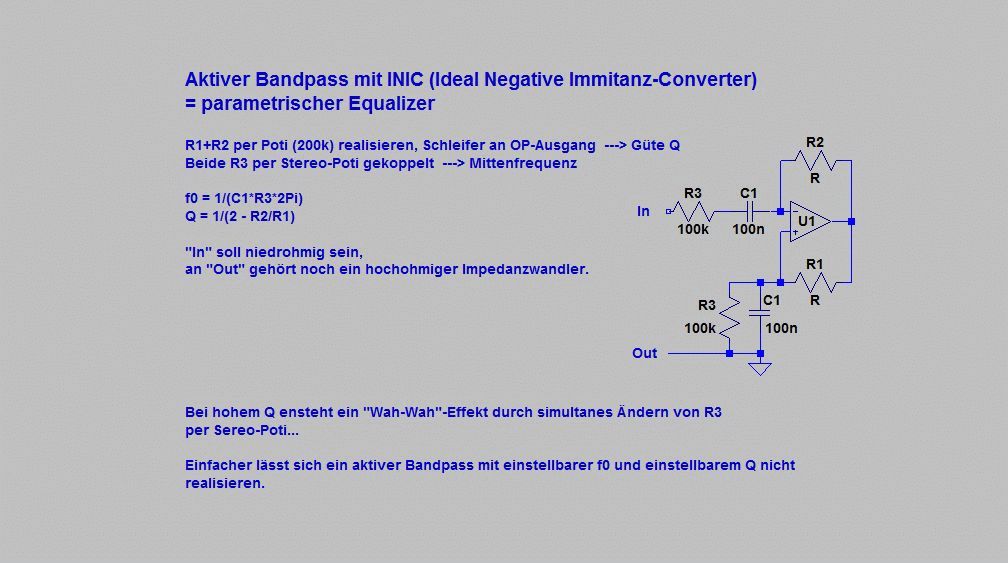 Falls das noch niemand erwähnt hat, man kann auch einen EQ mit Induktivitäten (Spulen) aufbauen. Der Aufbau ist sehr einfach. Für jedes f-Band wird eine Spule benutzt. Man benötigt prinzipiell nur zwei aktive Verstärkerelemente für den kompletten Aufbau, so weit mir bekannt. In Gitarrenverstärkern heute noch beliebt (früher auch in HiFi und Röhren-EQs). Kritisch ist, dass die Spulen Brummen einfangen können. Deshalb wickelt man die Induktivitäten für die tieferen Frequenzen besser jeweils doppelt im Gegensinn. Die Induktivität summiert sich dann auf den Sollwert, die Brummstörungen löschen sich aus.