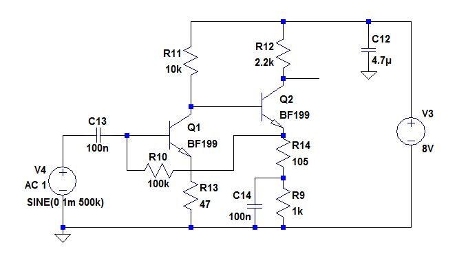 B e r n d W. schrieb: >> Mit wie viel rauschen muss ich denn hier rechnen? >> Arg mehr als bei einem Low Noise OPV? > > Es sollten richtige HF-Transistoren verwendet werden, mit zwei BC557 > fällt der Frequenzgang ab 100 kHz schon deutlich ab. Der BF199 wäre > geeignet, eventuell auch noch der 2N3904. > > Bei der vorgeschlagenen Schaltung habe ich festgestellt, daß R13 am > stärksten rauscht. Deshalb hab ich die Werte noch ein wenig bezüglich > Rauschen optimiert. Rauschen wird immer auf den Eingang bezogen, weshalb > die Werte in der Kurven jeweils durch die Verstärkung 1000 dividiert > werden müssen. Für einen noch rauschärmeren OPV müsste man schon >5€ > investieren. > > Die Simulation sagt ca 1,19nV / sqrt(Hz). Allerdings verursacht der > Ri=50 Ohm inzwischen den größten Rauschanteil, danach folgt erst Q1 und > R13. Hallo, ich habe nun die Schaltung mal aufgebaut. Jedoch kommt dabei nichts gescheites aus. Meine Vorgehensweise: Ich schalte am Eingang ein Frequenzgenerator mit 500 kHz und 100mVpp an. Dann messe ich mittels Specturmanalyer den Gain. Werte die mir der Spectrum analyser ausgibt: Am Eingang: -50 dBm Am Kollektor von Q1: -65 dBm Am Emitter von Q1: -60 dBm Am Emitter von Q2: -60 dBm Am Kollektor von Q2: -70 dBm (nur noch rauschen) Ich habe die Schaltung mehrmals geprueft und konnte keine Fehler finden... Habt ihr eine Idee weshalb die Transistoren nicht verstaerken? Der Dimensionierung ist genau wie in Bernds Anhang. Danke im voraus.