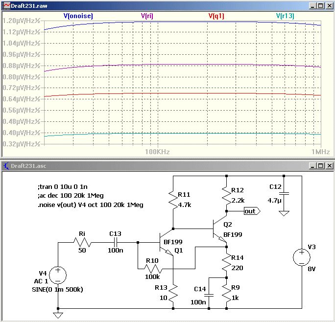 > Mit wie viel rauschen muss ich denn hier rechnen? > Arg mehr als bei einem Low Noise OPV? Es sollten richtige HF-Transistoren verwendet werden, mit zwei BC557 fällt der Frequenzgang ab 100 kHz schon deutlich ab. Der BF199 wäre geeignet, eventuell auch noch der 2N3904. Bei der vorgeschlagenen Schaltung habe ich festgestellt, daß R13 am stärksten rauscht. Deshalb hab ich die Werte noch ein wenig bezüglich Rauschen optimiert. Rauschen wird immer auf den Eingang bezogen, weshalb die Werte in der Kurven jeweils durch die Verstärkung 1000 dividiert werden müssen. Für einen noch rauschärmeren OPV müsste man schon >5€ investieren. Die Simulation sagt ca 1,19nV / sqrt(Hz). Allerdings verursacht der Ri=50 Ohm inzwischen den größten Rauschanteil, danach folgt erst Q1 und R13.