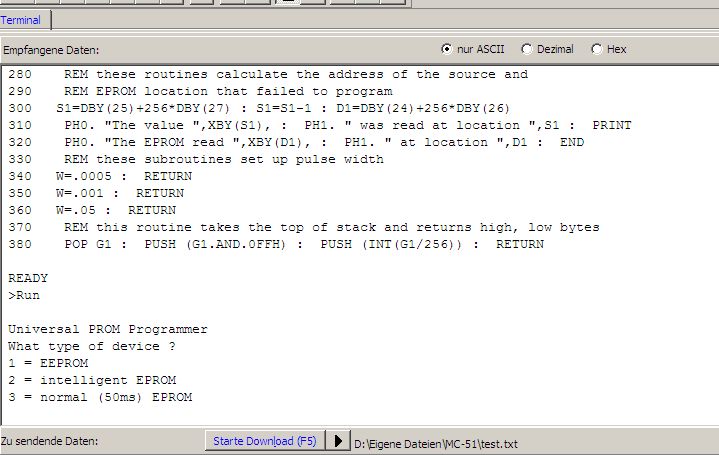 bekommst du Programmcode ins EProm? Wenn du einen Basic Interpreter