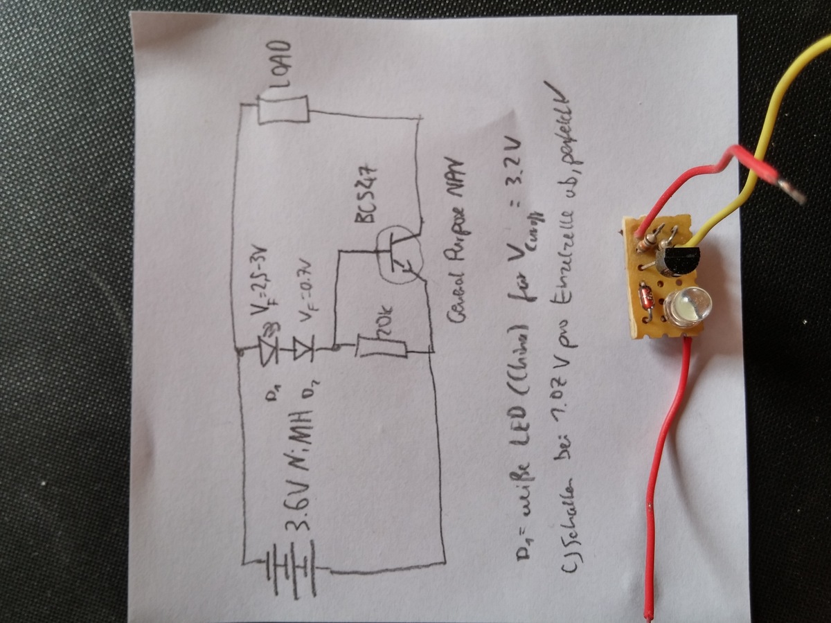 Problem: Billige Outdoor LED-Lichterkette(3xNiMH, Schalter, 470 Ohm Widerstand und 20 LEDs) entlädt die 3 Akkus zu tief. Lösung: Billigsten&einfachsten Tiefentladeschutz ausgedacht (Hat jemand diese Schaltung vorher schon benutzt?), mit den angegebenen Bauteilwerten wird der LED-Strang bei genau 3.2V getrennt, was einer Cutoff-Einzelzellenspannung von ca. 1.07V = 1V entspricht. Dann zieht die Schaltung nur noch kleiner als 20uA, selbst im Betrieb ist sie dank 20k sehr sparsam. Hat sowohl in der Simulation als auch in der Praxis super funktioniert, wurde gleich eingebaut. Kann man bestimmt auch anderweitig verwenden.