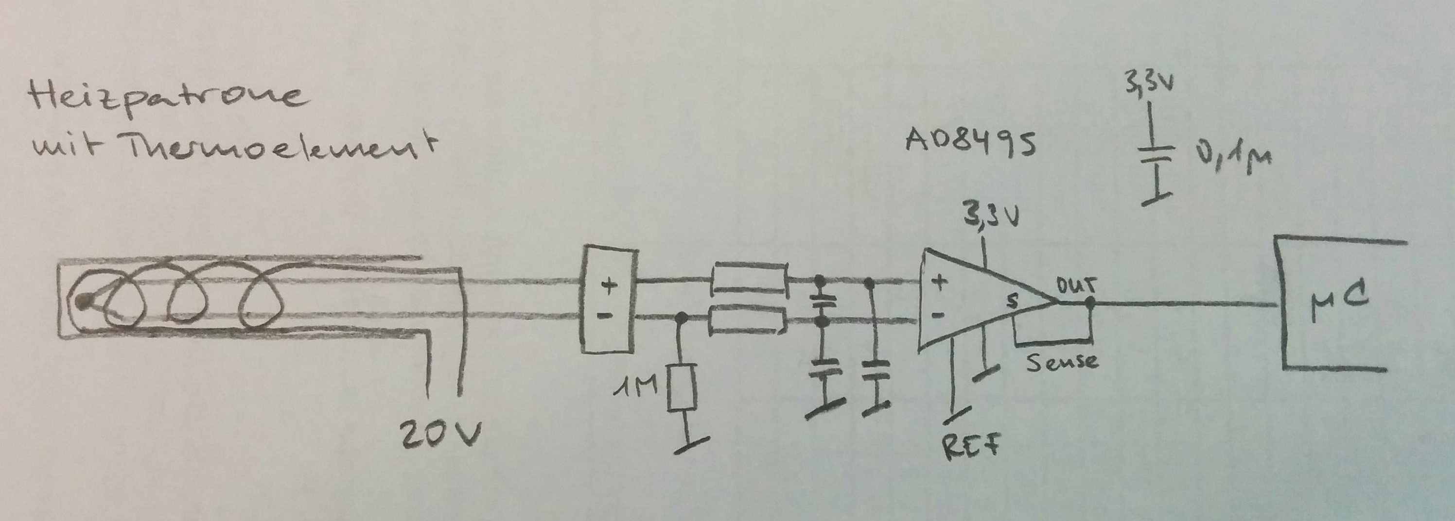 Ein Kurzschluss ist unwahrscheinlich. Ich habe über 10 Thermoelemente getestet und die Spannung springt immer (Wenn Sie es dann tut, meistens beim ersten mal aufheizen) auf die selbe Spannung hoch (4V). Mit der - Leitung auf GND, funktionierts dann eigentlich gut. Aber ich möchte das Filter ja immernoch auf der + Leitung anwenden, wie sollte das am besten aussehen? Die 20V kommen von einem Netzteil, welches vileicht ein bisschen mehr Noise auf der Spannung aufweist. Kanns sein das da etwas aufs Thermoelement induziert wird??