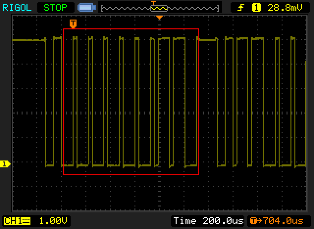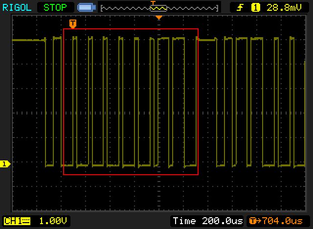 Hallo zusammen, leider muss ich meinen ersten Beitrag in diesem Forum direkt mit einem großen "Sorry, ich muss eine Frage stellen" beginnen. Bisher konnte ich vieles als reiner Leser erledigen, nun ist es aber leider so weit, ich weiss nicht weiter ;-). An einem Arduino Mega (2560) habe ich mehrere TSIC 206 getestet, alle mit dem gleichen Ergebnis: Sie geben viel zuviel aus (ca. 50°C statt gefühlter 21-22°C). Da mir anfänglich die Arduino Library spanisch vorgekommen ist, habe ich das Rad neu erfunden und den ganzen Nachmittag über mit Oszi und Arduino IDE einen neuen Reader für den Input gebaut, das Ergebnis ist "identisch falsch" mit der bereits erwähnten Library. Von den Nachkommawerten abgesehen ergibt das erste Byte immer ein 0x3 oder 0x4, sprich binär 0b0011 oder 0b0100. Laut Datenblatt liegen hier Temperaturen ab ca. 50°C, davon sollte ich weit entfernt sein. Eine ungefähr richtige Richtung wäre es mit einem 0x2 bzw 0b010, aber soweit fällt der Fühler niemals hinunter. Externe Temperatur Einflüsse sind auszuschliessen, der Fühler steckt Mutterseelen allein auf einem Breadboard. Tiefpass und Vorwiderstand für VCC habe wie im Datenblatt beschrieben getestet, leider bringt es nichts. Von den Fühlern habe ich 10 Stück hier, die Hälfte ist getestet und alle zeigen die gleichen Werte. Der Screenshot von meinem Oszi im Anhang zeigt rot umrandet das erste Byte des Signals. Bit 1 und 2 sind definitiv "1", die Parität ist auch korrekt auf "0" gesetzt, die Werte sind ja bereits gerade. Hat irgendwer schon soetwas Ähnliches erlebt, oder eine Idee an was es liegen könnte? Es existiert auch kein Unterschied zwischen 3,3V oder 5V (davor wird ja immer gewarnt), das erste Byte zeigt immer einen um ca. Faktor 2 zu großen Wert an. Danke im voraus! LG, Ralph