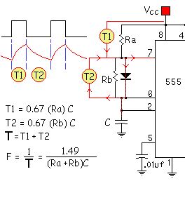 http://www.elektronik-kompendium.de/public/schaerer/st555.htm http://www.elektronik-kompendium.de/public/schaerer/bilder/st555_02.gif wie man im Bild sehr schön sehen kann, ist der Pin 7 mit einem Transistor im Inneren des 555er verbunden. Mit diesem Pin wird der frequenzbestimmende Kondensator entladen. Beim Aufladevorgang ist dieser Transistor hochohmig und der Kondensator wird nur über den Widerstand gegen VCC aufgeladen. Der Ausgang am Pin3 ist hingegen in der Lage, sowohl Strom zu liefern, als auch aufzunehmen (Push-Pull-Endstufe). Die Strombelastbarkeit ist hierbei symmetrisch (+-200mA). Bei entsprechend hohen Widerstand also für die Berechnung nicht von Belang, der der resultierende (Ent)Ladestrom viiel kleiner ist. Verwendest Du nun einen Widerstand am PIN3 werden auch die Umladezeiten kostant bleiben. das Tastverhältnis liegt bei 50%. Jetzt bekommst Du eine "1". :-) AxelR.
