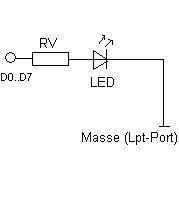 Der Vorwiderstand wird an den Druckerport angeschlosse,dieser versorgt(wenn er eingeschaltet(OUT888,1 für D0)) die LED mit der nötigen Spannung. Rv=Uport-Uled/Iled, Rv = 5V-3,2V/0.015A = 120Ohm. Ich habe mal angenommen Du hast eine LED mit 1,8Volt und der Strom durch die LED beträgt 15mA. Diesen Strom sollte der Druckport schon liefern können.