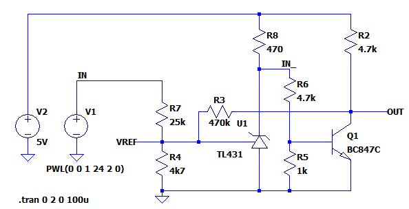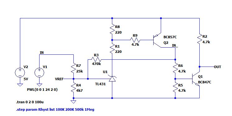 hinz schrieb: > Stefan U. schrieb: >>> Vout will ich mit einem INT-Eingang vom ATtiny auf >>> fallende Flanke abfragen. >> >> Da kannst den analogen Komparator verwenden und auf den TL431 >> verzichten. > > Das ist zu einfach! Wenn die 5V/2 als Referenz genau genug sind, dann ja. Es kostet halt immer Aufwand, wenn man ein Bauteil für eine unegwöhnliche Anwendung verwenden will. Natürlich ist der gewählte Strom im TL431(55mA) und die 500mW im 1k WIderstand der Wahnsinn. Hier mal eine verbesserte Version und eine noch bessere mit zusätzlichem PNP Transistor.