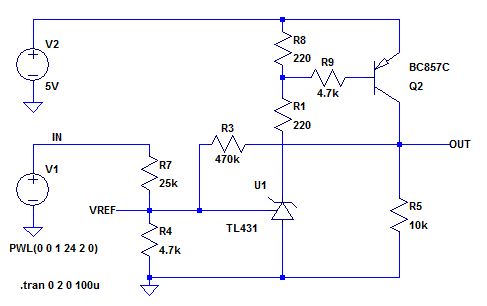 Morgen, ich hab eine Schaltung simuliert, wo mit einem TL431 24V überwacht werden. Wenn die unter ca. 13-14V fallen soll 5V geschaltet werden. Rein von der Simulation passt anscheinend alles. Aber könnte es so auch in der Praxis funktionieren? Oder fehlt irgendwas bzw. falsche Werte? Und vorallem, passt der Transistor oder welcher muss mindestens hin?