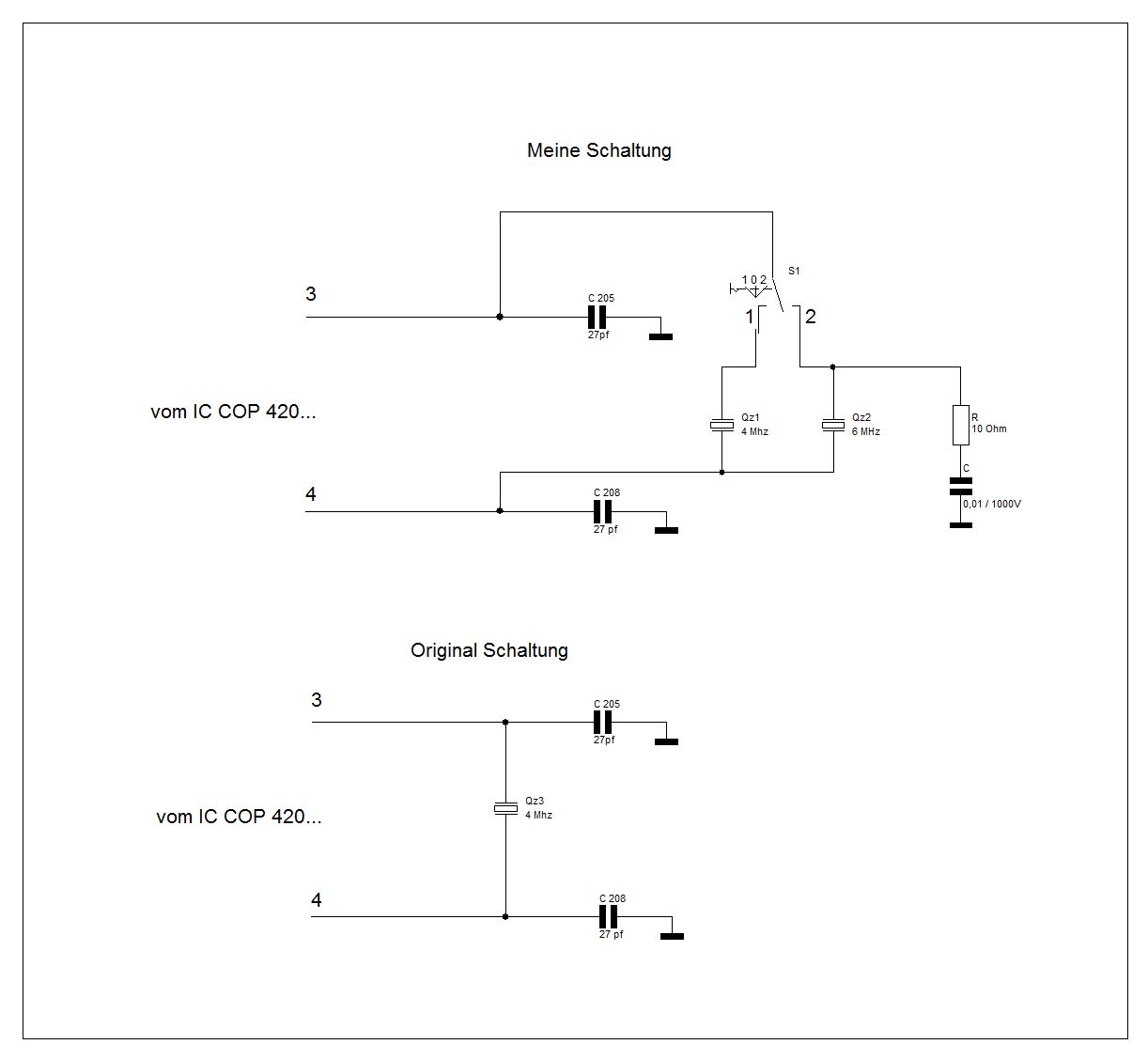 In der Fernbedienung ist jetzt der Originale 360 khz, und ein 440 kHz Quarz drin, zwischen diesen beiden Schalte ich um. Ich hatte ja am Anfang in der Fernbedienung die 440 kHz eingebaut, komme aber mit der Spule zur keiner Synchronisation, sprich die Anlage reagiert da nicht. Ich habe mir auch schon überlegt, ein 2,09 MHz Quarz zu besorgen und die dazugehörigen 56 pf Kondensatoren, so wie es im Datenblatt des COP 420 beschrieben ist. Jetzt kommt das Problem: Was für ein Quarz kommt dann in die Fernbedienung? Ich verstehe den Zusammenhang nicht: 360 kHz in der Fernbedienung, und 4 MHz im Gerät. Wie passt das zusammen? Nach meinem Verständnis, müssten doch beide Quarze dieselben sein. Halbe Frequenz im Gerät, gleich halber Quarz in der Fernbedienung? 180 kHz?.