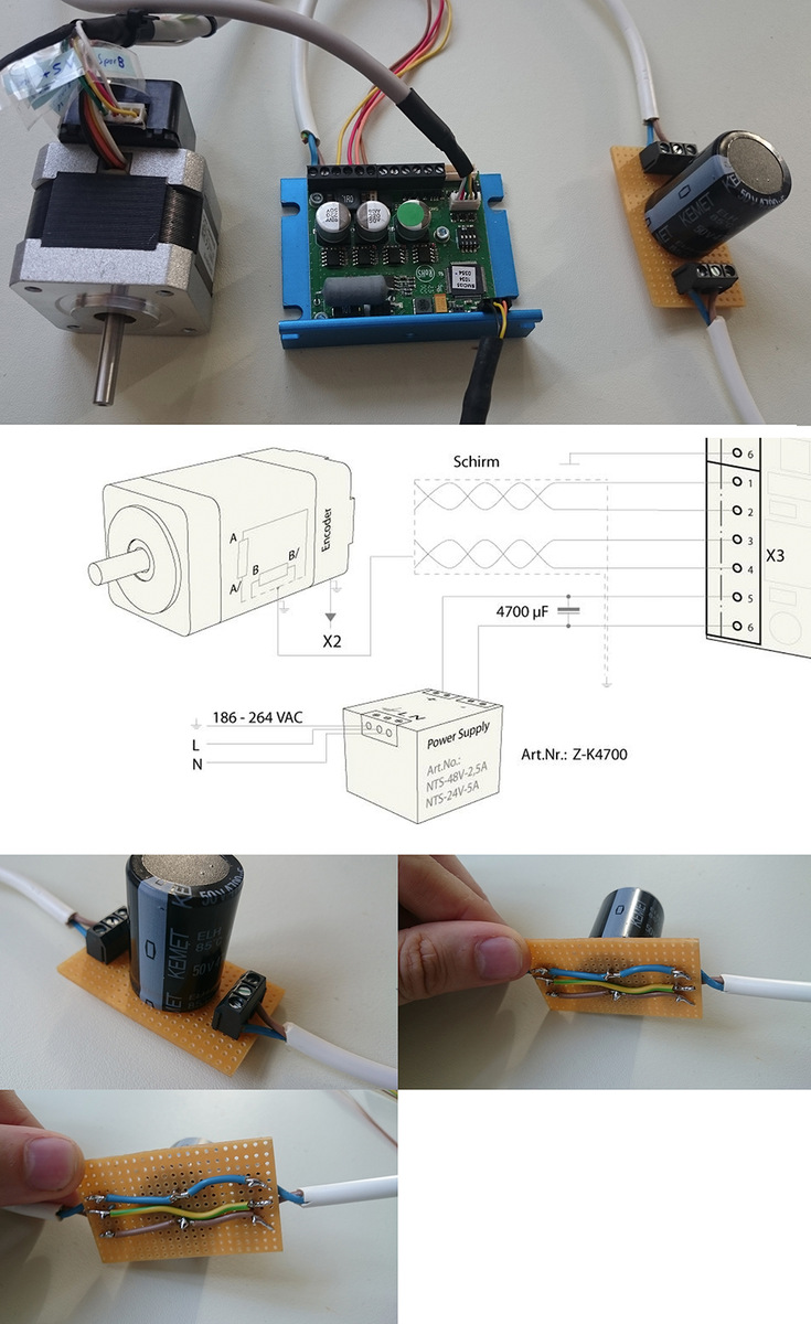 Vielleicht ist die Frage nun etwas dumm, aber woher weiß ich wie groß der Kondensator und das Netzteil dimensioniert sein muss? Ich habe nun ein Kondensator (4700 μF, 50V) verwendet so wie er auf der Nanotec Seite zu finden ist und vorgeschlagen wird. Kann ich mit einem 24V Netzteil, dem SMCI35 (max. 4A) und dem Motor (0.85A, ST4118M1206) was falsch machen bzw. können da zu große Bremskräfte entstehen oder ein zu großer Elko für das Netzteil, sodass es zum Kurzschluss kommt? Habt vielen Dank, dass Ihr mir so aufgeschlossen helft!