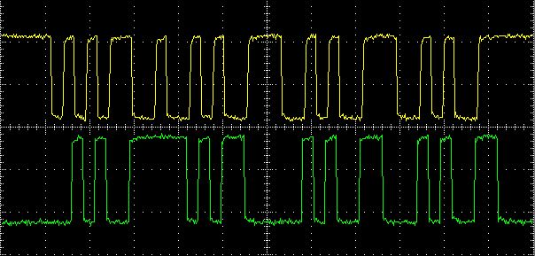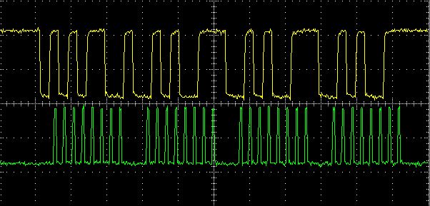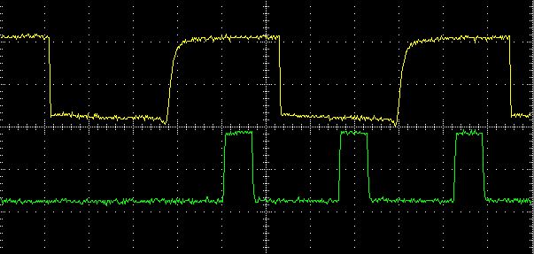 Hier noch ein paar Oszibilder zum Programmiergerät. Bild "ProgBit.bmp" zeigt das Taktbit (SCL) im Verhältnis zum Datenbit (MOSI). Die steigende Flanke des Taktsignals übernimmt das Datenbit im Controller, sie liegt exakt in der Mitte des Datenbit. Bild "ProgEna.bmp" zeigt die übertragung des 4-Byte Kommando ProgEna zur Freigabe der Programmierung ACh, 53h, 53h, 53h. Jedes Datenbyte benötigt 8 Taktimpulse, die vier mal acht Taktimpulse sind schön zu sehen. Bild "ProgAntw.bmp" zeigt oben (gelb) das Signal MOSI zum µC und unten (grün) das Antwortsignal MISO des µC zum Programmer. :)