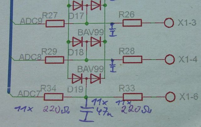 Nochwas zur Eingangsbeschaltung: habe damit natürlich viel experimentiert, sieht man auch an den nachträglich eingezeichneten Cs. Die Kondensatoren haben eine geringe Verbesserung gebracht. Die Widerstände habe ich auch variert, ohne deutliches Ergebnis. Weglassen will ich die auf keinen Fall, falls jemand im Stromnetz einen Kurzschluß baut dürften enorme Spannungsspitzen entstehen und das muß das Gerät abkönnen. Wünsche noch einen schönen, sonnigen Novembersonntag!