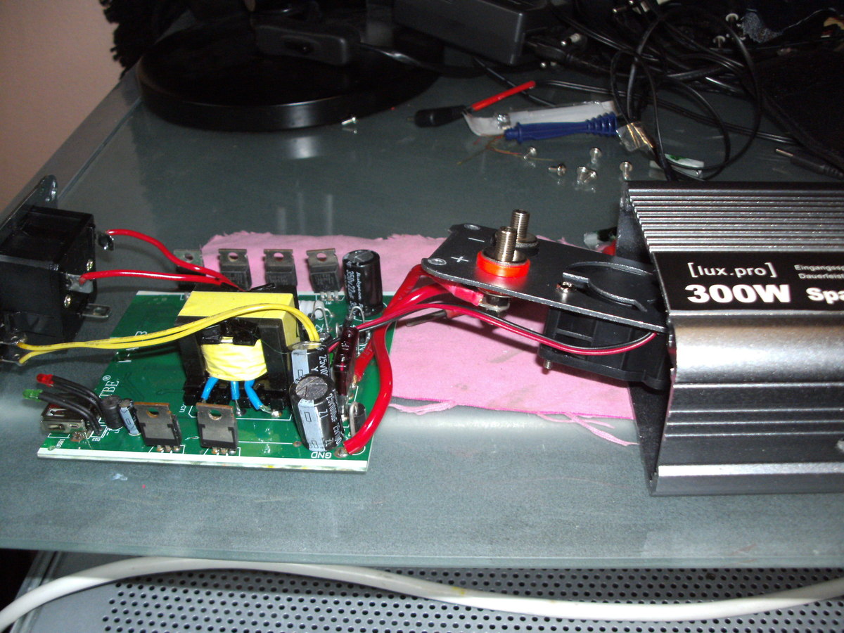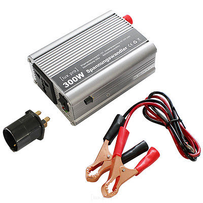 Da auf der Angebotsseite des Händlers http://www.ebay.de/itm/lux-pro-SPANNUNGSWANDLER-300W-3000W-12V-230V-WECHSELRICHTER-INVERTER-PKW-LKW-/371285944020?var= keine Angaben zum Ausgang gemacht werden, sollte man von 'modifiziertem Sinus', also Treppchen mit wenigen Stufen ausgehen. Diese Wellenform kollidiert mit etwaigen Eingangsfiltern in Geräten und führt zu Stromspitzen durch die X-Kondensatoren die wiederum die Sicherheitsschaltung im WR auslösen. Kurz - das Gerät ist ungeeignet und sollte durch einen echten Sinus WR ('True Sine') ersetzt werden. @TE: Du hättest uns auch mal den Link auf ebay oder so posten können, dann muss man nicht so lange rumsuchen.