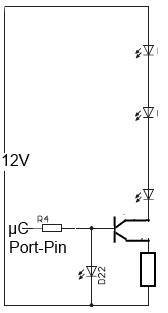 Hallo Zusammen, Ich Schalte meine LEDs mit Folgender µC Schaltung (Digitaler_Encoder_mit_LED.png). Dabei kann ich je nachdem welches Datenwort ich an die Port - Pinne meines µC anlege unterschiedliche LEDs zum leuchten bringen. Jetzt würde ich die Schaltung gern so erweitern das ich drei LEDs zusätzlich zu der vorhanden LED ansteuern kann. Da kam mir die Idee mit einer Pegelwandlung mittels Transistor (Pegelwandlung.png) aber ich habe bei meiner µC Schaltung ja gar keine gemeinsame Masse :-(. Jetzt stehe ich auf dem Schlauch, hat jemand eine Idee wie ich an dieser µC Schaltung (Programm ist Fertig und läuft) mehr LEDs angesteuert bekomme. Danke für die Hilfe Gruß Detlev