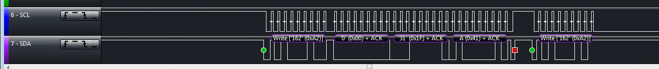 Hallo Forum, ich habe hier einen STM32F103VB und daran angeschlossen an I2C1 ist ein EEPROM. Nach Konfiguration der CPAL klappt auch ein einfaches Schreiben und Zurücklesen von Werten in und aus dem EEPROM. Verwendet wird der DMA mode. Dazu verwende ich das Beispiel aus stm32_eval_i2c_ee_cpal.c. Wenn ich mir die Übertragung im Logic Analyzer ansehe, dann sehe ich, dass die Übertragung komisch segmentiert ist. Selbst der erste Testbuffer "ABC" wird nicht komplett in einem Transfer übertragen. EEPROM Schreibadresse: 0xA2 Ablauf: Schreiben von "ABC" ab Adresse 0x001F. Zurücklesen Schreiben von "DEFG" ab Adresse 0x1F3F. Zurücklesen Dieser Ablauf ist mit dem Logic Analyzer als 5 Transfer Blöcke zu sehen. Zwischen den Transfer Blöcken liegen rund 31ms. Die Blöcke sind nicht gleich lang. Zwischen Auslesen der ersten Zeichenfolge und Schreiben der zweiten Zeichenfolge liegt fast keine Pause (transfer3.png). Es funktioniert also alles korrekt, nur die Zeitliche Abfolge und die Segmentierung wundern bzw. stören mich etwas. Im 1. Transfer wird beispielsweise nach dem "A" mit einem STOP abgebrochen. Dann kommt ein Start mit WRITE und ein NAK... dann dauert es ~31ms und dann geht es korrekt weiter. Hat jemand eine Idee was in der CPAL zu dieser Segmentierung führen könnte?