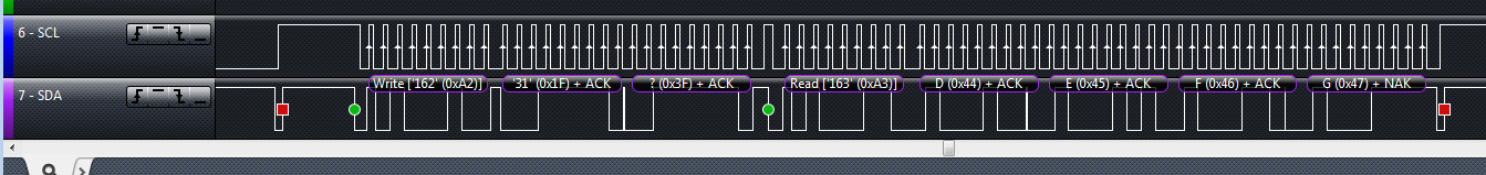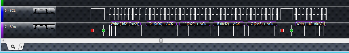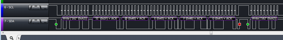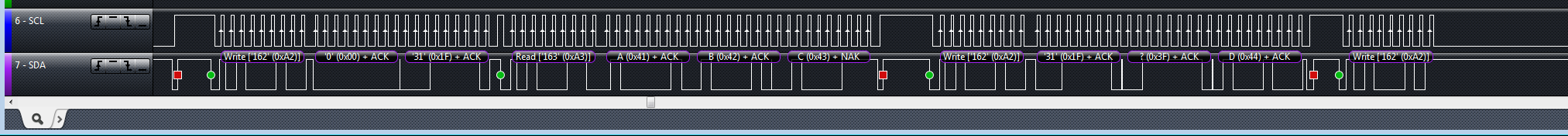 Jetzt ist mir einiges klarer geworden. Die Zerstückelung bei der Übertragung eines Buffers liegt an den gewählten Adressen. Die Adressen liegen jeweils auf dem letzten Byte einer Page (32 Byte pro Page). Wähle ich die Adressen so, dass "ABC" und "DEFG" in jeweils eine Page passen, dann sehe ich nur noch 3 Transfers. 1. Schreiben von "ABC" 2. Lesen von "ABC" und sofortiges Schreiben von "DEFG" 3. Lesen von "DEFG" Dazwischen wieder jeweils ~31ms. Was mich noch wundert ist das WRITE am Ende jedes Transfers wie oben zu sehen. Vermutlich ist das der Anfang vom folgenden Befehl und das EEPROM ist noch mit Schreiben beschäftigt und gibt kein ACK?! Nach dem Lesen klappt dann ein Schreiben sofort. Klingt eigentlich logisch. Das EEPROM ist übrigens ein 24AA64-I/SN von Microchip. Wie lange der interne Write-Zyklus dauert habe ich im Datenblatt nicht gefunden. Im Datenblatt des EEPROMS steht, dass man das Ende des Write-Zyklus nur durch Polling herausfinden kann. Das wird hier aber offensichtlich nicht gemacht. Die Wartezeit von ~31ms muss also irgendwie aus der CPAL kommen. Damit hat sich eigentlich erst einmal alles geklärt.