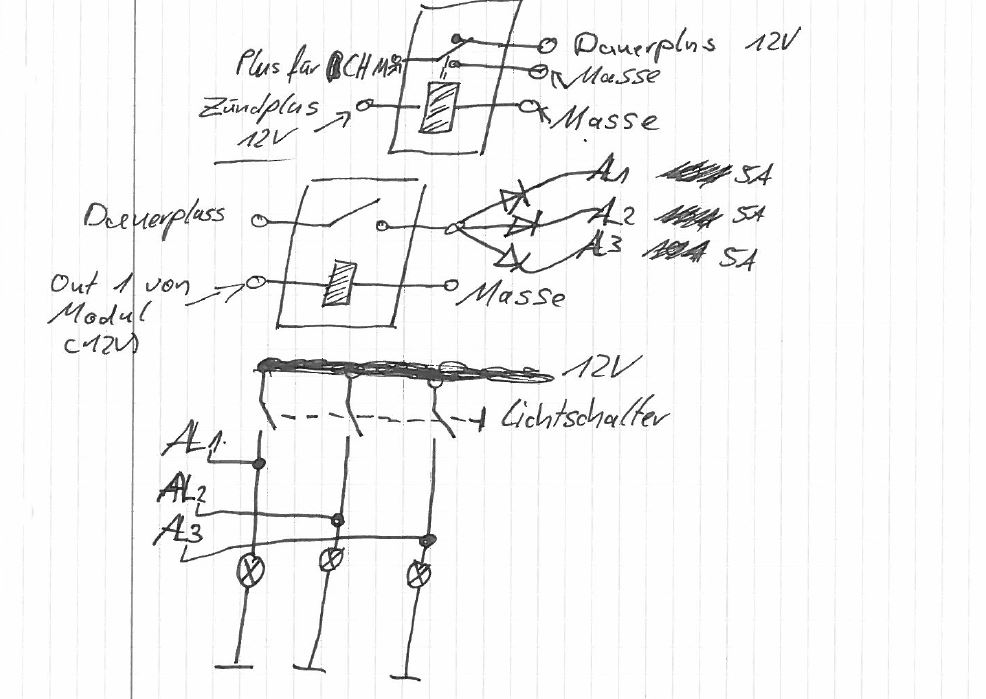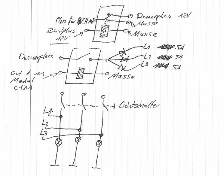 Guten Tag, ich habe mir ein sehr Günstiges CH und LH Modul gekauft und ich wollte es gerne erweitern. Ich möchte gerne alle Lampen im Auto für 30Sek leuchten lassen desswegen habe ich mir 2 Relais bestellt und ein paar sperrdioden. Wichtig ist ja nur das sich das Modul abschaltet sobald die Zündung betätigt wurd da ich einfach per Stromdieb die Kabel angezapft habe. Ist mein denken so richtig? Ich habe extra Sperrdioden in die zuleitungen vom Lastrelais zum Lampenkabel gelegt. (damit beim Anschalten eines Lichtes nicht gleich alle anderen mit leuchten) Kann ich einfach so per Stromdieb nach dem Lichtschalter auf das Lampenkabel zugreifen? oder kann da etwas passieren? Mit freundlichen Grüßen Kurt
