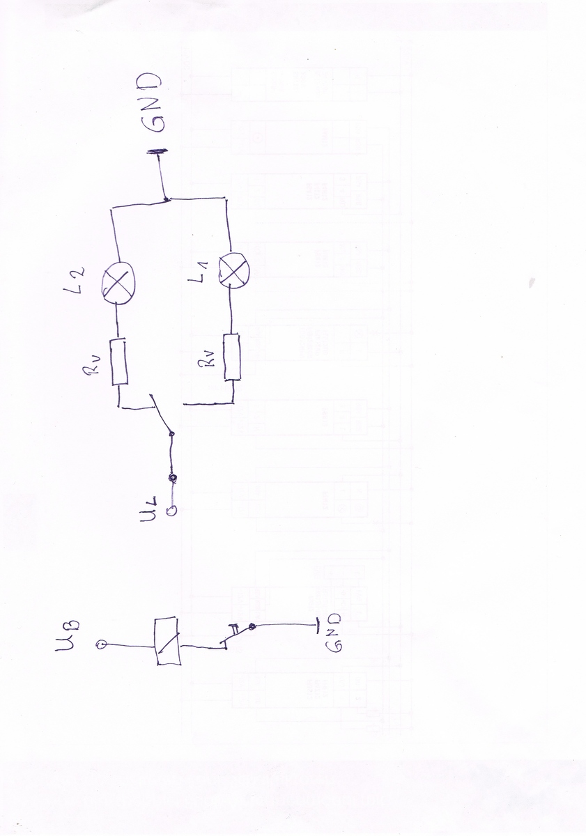Ja sorry, meine Beschreibung ist wirklich trivial. Also, die Spannung kann max. mit 12 V DC bereitgestellt werden. In der Anlage habe ich kurz aufgezeichnet, wie eine Relaisschaltung aufgebaut wäre. Einfacher Wechselkontakt, der im Ruhezustand bzw. aktiven Zustand des Relais jeweils ein anderes Lämpchen einschaltet.