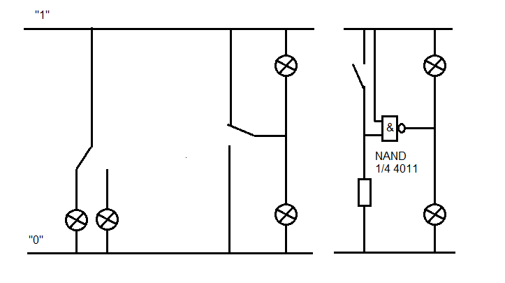 Sorry kleiner Nachtrag Den Widerstand kannst du mit 5 -10 K setzen. Den brauchst du, um bei offenem Schalter auf das andere Potential (GND) den Eingang vom NAND zu ziehen. Gruß oldmax