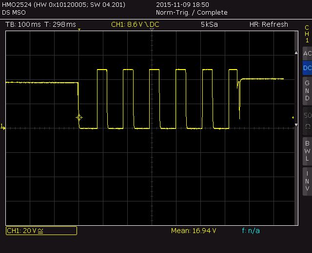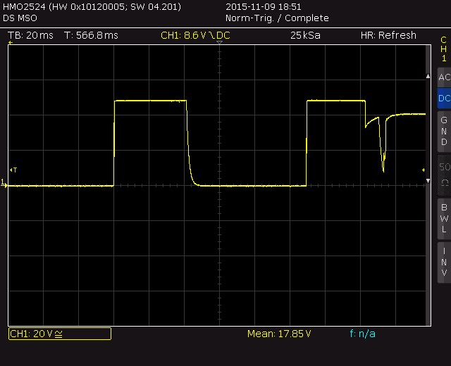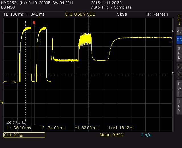 Ich habe mal mit 48V / 1200R gemessen, der Kontakt sieht eigentlich ziemlich gut aus, abgesehen davon, dass er nach dem letzten Wahlimpuls nochmal für etwa 5ms "einbricht" und die Impulsdauer etwas länger als 100ms ist. Die Plots zeigen den Spannungsfall an dem 1200R Widerstand zwischen Masse und dem Telefon. Die "Telefonanlage" ist ein Speedport W701V, soweit ich weiß, dürfte der kein IWV unterstützen...