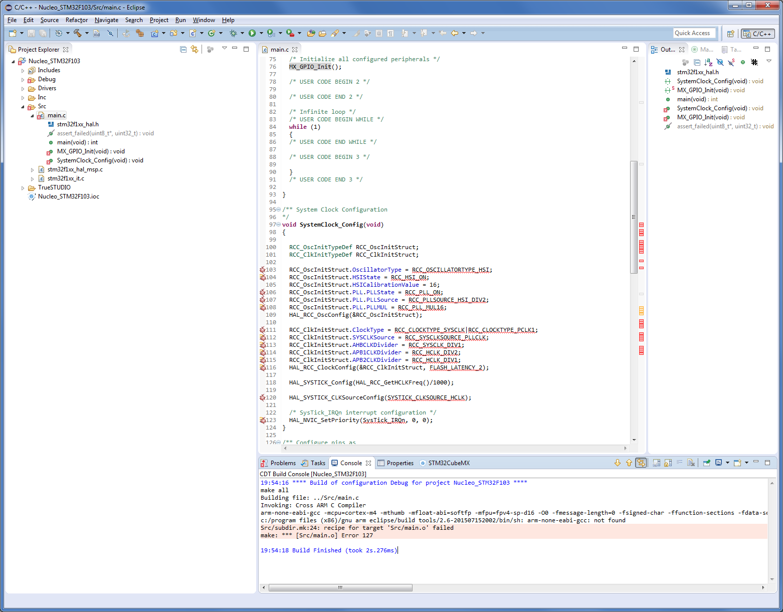 Hallo, ich bin absoluter Neuling im Bereich Arm-Cortex Prozessoren und brauche bitte Eure Hilfe. Ich habe mir ein Nucleo-Board (STM32F103) besorgt und versuche dazu die Eclipse GCC ARM Toolchain einzurichten. Dafür habe ich das tolle Tutorial unter http://klaus4.blogspot.de/2014/05/stm32f4-discovery-mit-opensource.html durchgearbeitet. Am Ende wenn es darum geht zu compilieren bekomme ich mehrere Fehler in der main.c angezeigt z.B. Typ XYZ could not be resolved. Außerdem wundert es mich dass in der Console folgendes angezeigt wird: c:/program files (x86)/gnu arm eclipse/build tools/2.6-201507152002/bin/sh: arm-none-eabi-gcc: not found Wieso wird da auf diese Verzeichnis zurückgegriffen, wenn ich meine GNU-Tools, wie im Tutorial angegene in C:\stm32tc\GnuWin32 installiert habe? Danke!