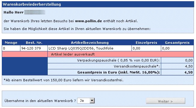 Ich nehme (vorerst) alles zurück, was ich hier negatives über Pollin gesagt habe: Habe gerade die zwei TFTs bekommen, und dass obwohl ich eine Nachricht bekommen habe, der Artikel sei ausverkauft... Lustig finde ich die Option, den ausverkauften Artikel nochmals zu bestellen. Wer kommt denn auf solch dumme Ideen ?