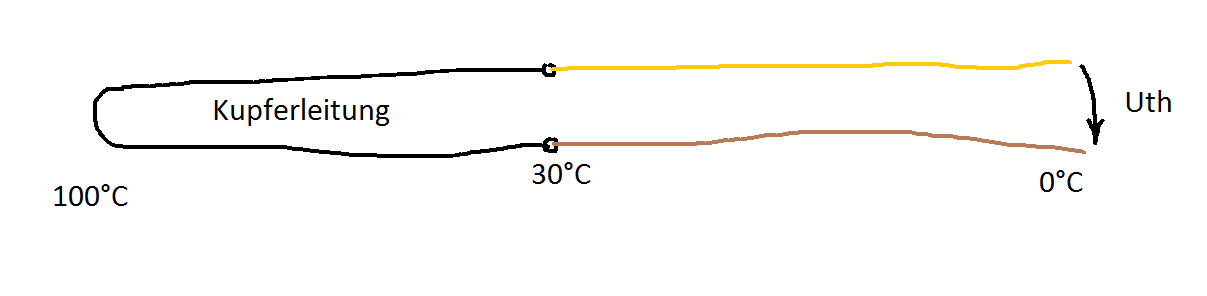 Hallo zusammen, bin gerade dabei, das Prinzip eines TE Kalibrators zu verstehen. Dazu würde ich gerne folgendes wissen: Welche Spannung Uth stellt sich ein, wenn die 2 Thermodrähte (sinnvolles Materialpaar) nicht unmittelbar miteinander in Kontakt sind, sondern über eine "lange" (z.B. 1m) Kupferleitung miteinander verbunden sind, wobei diese Leitung durch unterschiedliche Temperaturbereiche verläuft (siehe Skizze, Leitungen in unterschiedlicher Farbe sind das Thermodrahtpaar)? Gibt es da die gleiche Thermospannung, wie wenn sie an der Stelle wo sie enden (30°C) direkt miteinander verbunden wären? Danke!