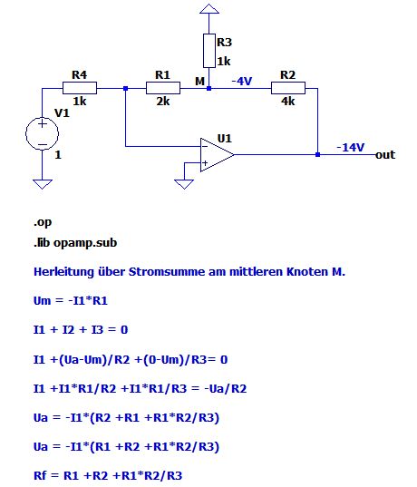Herleitung über Stromsumme am mittleren Knoten M. Um = -I1*R1 I1 + I2 + I3 = 0 I1 +(Ua-Um)/R2 +(0-Um)/R3= 0 I1 +I1*R1/R2 +I1*R1/R3 = -Ua/R2 Ua = -I1*(R2 +R1 +R1*R2/R3) Ua = -I1*(R1 +R2 +R1*R2/R3) Rf = R1 +R2 +R1*R2/R3 Im Anhang die Simulation mit LTspice mit 1mA Strom (1V/1kOhm). Damit genauere Werte herauskommen habe ich die Leerlaufverstärkung im Opamp auf 1Million geändert. (Rechstklick auf Opamp-Symbol im Schaltplan)
