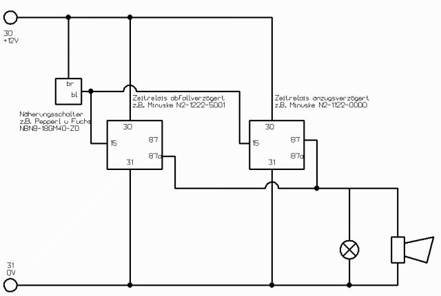 Toni K. schrieb: > Hallo, > > o.k. also einen bündigen mit M18 Gehäuse finde ich auf der Seite auch, > aber wie geht es dann weiter? Brauche ich spezielle Kabel und Stecker? > Muss ich mir noch eine spezielle Schaltung bauen oder ist die im Sensor > enthalten. Wie ich sehe, gibt es Öffner und Schließer. Meine spannendste > Frage ist aber, worauf soll der Sensor reagieren? Nur das Drehen des > Motors ändert ja sicher nichts. Ich muß wohl ein Flacheisen o.ä. auf die > Welle schrauben, das dann am Sensor dicht vorbei läuft (ähnlich wie beim > Fahrradcomputer)? Oder verstehe ich da was falsch? > > VG Toni Der Näherungsschalter hat alles was zum Schalten nötig ist bereits eingebaut. Man braucht nur noch den dazu passenden Stecker, wenn nicht bereits ein Kabel montiert ist. Am Einfachsten ist es, auf die Welle an passender Stelle eine 10er Mutter zu schweißen, auf die der Näherungsschalter reagieren kann. Für die ganze Überwachung benötigt man dann nur noch zwei Zeitrelais, ein Anzugsverzögertes und ein Abfallverzögertes Und Hupe und/oder Leuchtmelder. Ich habe mal einen Schaltplan angehängt, wie sowas funktionieren würde. Frank