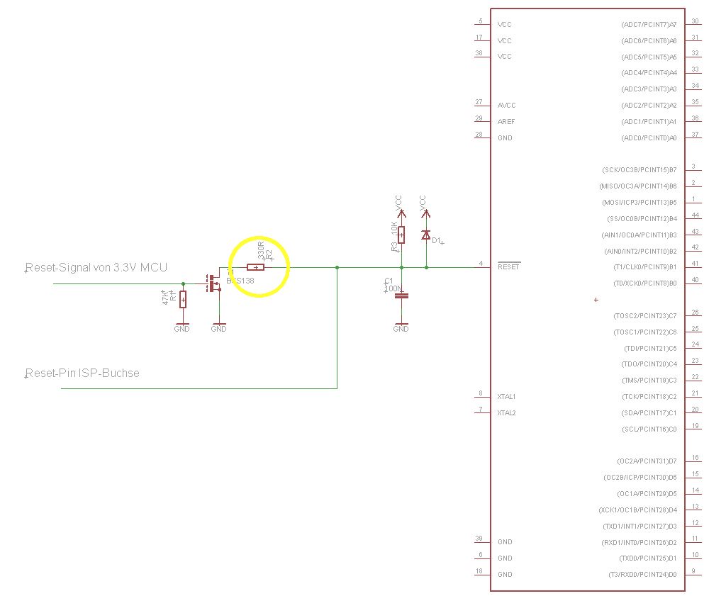 Braucht man in der beigefügten Reset-Schaltung R2 zur Strombegrenzung? T1 (BSS138: http://de.rs-online.com/web/p/transistoren-mosfet/6710321/) soll den AVR resetten und wird von einer 3,3V-MCU geschaltet, der AVR arbeitet mit 5V. Am Reseteingang ist ein 100N-Kondensator. Ich habe R2 eingezeichnet, um den Stom zu begrenzen, der vom Kondensator kommt. Aber ist das nötig? T1 kann 0,17A vertragen, Rds(on) ist 10 Ohm. Theoretisch würden kurz 0,5A fliessen, oder?