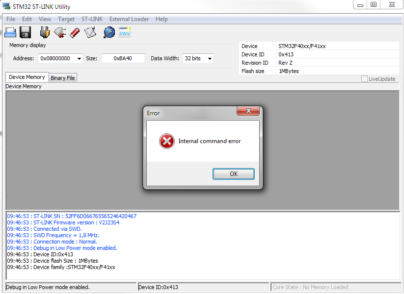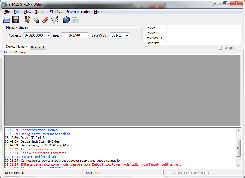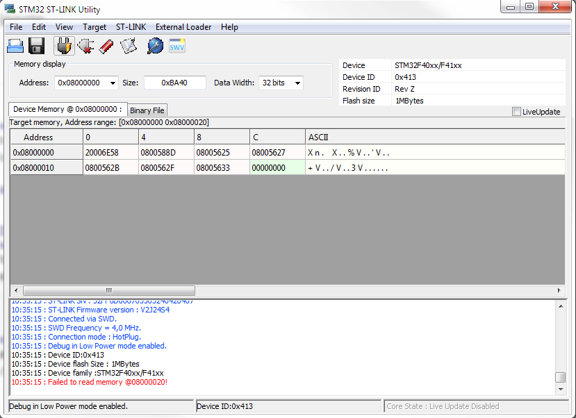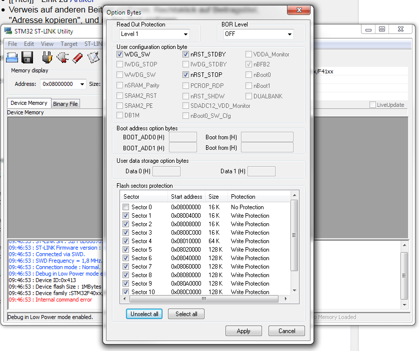 Hallo zusammen Ich möchte meinen STM32F407ZG löschen. Dazu wollte ich das ST-Link Utility verwenden zusammen mit einem ST-Link (neueste Firmware) und SWD. Die Kommunikation scheint grundsätzlich zu funktionieren. Die Device ID ist korrekt erkannt. Leider meldet das Tool "Internal Command Error" sowie dass die "ReadOut Protection" aktiv ist. Dies mag wohl stimmen, aber kann mann bei ReadOut Protectin nicht löschen? Zudem habe ich ein hex File eines Bootloaders, welchen ich in den Chip laden muss. Dieser gehört an Adresse 0x00000000 Wenn ich jedoch diese eingebe beim Tool meldet es "Address out of Range" Wie kann ich den Bootloader an 0x00000000 schreiben? Danke schonmal und Gruss Im Anhang ein Bild des ganzen