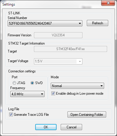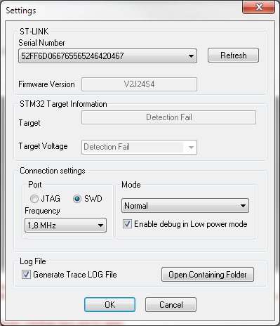 Mike R. schrieb: > Zumindestens bei mir zeigt er als Version V2.J24.S4 an. Vielen Dank für den Hinweis. Ich habe nun geupdated. Leider erkennt er jetzt den Chip überhaupt nicht mehr. Im anhang zwei screenshots. Einmal mit alter Firmware einmal mit neuer. Interessant ist, dass er bei der alten Firmware 1.5V als Targetvoltage (manchmal 1.4V) erkannt hat. Die Kondensatoren auf dem Board haben aber alle 3.3V mit ausnahmen jenem für die AVCC (vermutlich, ich habe kein schema) Mit der alten Firmware konnte er nur mit 1.8MHz und 4.0MHz die DeviceID auslesen. mit weniger als 1.8MHz gings nicht. Mein Kabel vom ST zum Board ist ca 30cm Lang. Kann es daran liegen? Danke