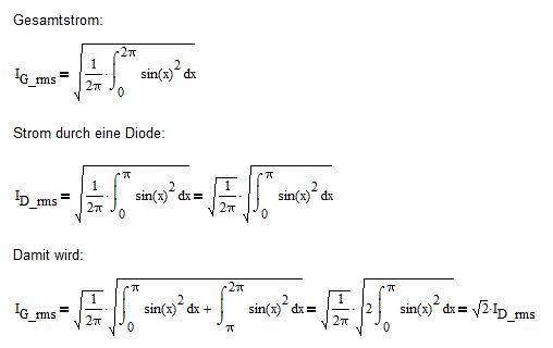 Ich würde gerne die jeweiligen Einzelströme eines Sinusstromes durch 2 gleiche antiparallel geschaltete Dioden ermitteln. Wenn der Gesamtstrom in I_rms gegeben ist, wie hoch ist dann der jeweilige Einzelstrom der Dioden I_D1_rms und I_D2_rms? Zunächst würde ich vermuten, dass es jeweils I_rms / 2 ist, denn jede Diode leitet ja genau eine Halbwelle. Anders überlegt komme ich jedoch auf ein anderes Ergebnis: r_dyn sei vereinfacht gesagt der dynamische Widerstand der Diodenkennlinie im Durchlassbereich, der wohl im entscheidenden Bereich als konstant angesehen werden kann I_D1_rms = I_D2_rms P_ges = 2 * P_D1 P_ges = I_rms^2 * r_dyn 2 * P_D1 = 2 * I_D1_rms^2 * d_dyn weil P_ges = 2 * P_D1 I_rms^2 * r_dyn = 2 * I_D1_rms^2 * r_dyn aufgelöst nach I_D1_rms: I_D1_rms^2 = 2 * I_rms^2 / 2 -> I_D1_rms = I_rms / 1,414 Somit wäre also der Effektivwert des Stromes in einer Diode nicht wie zunächst angenommen die Hälfte des Gesamtstromes, sondern 70% davon. Aber wie können sich denn 100 % zu 2 mal 70 % aufteilen? Was davon ist denn nun richtig? Wo liegt der Denkfehler?