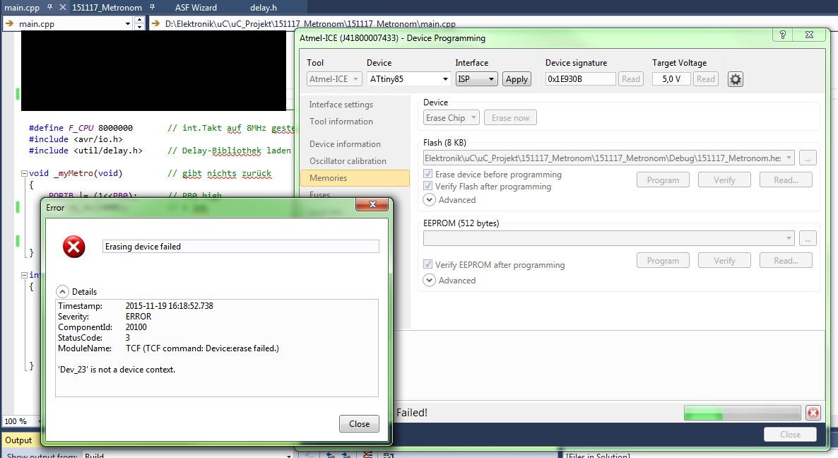 Hallo zusammen. Habe gestern das Erste mal ein Programm, via Win7, Studio 7.0 und Atmel ICE, auf uC übertragen wollen. Unmittelbar nach Fehlermeldung "Dev_23" brach der Prozess ab. Siehe Anhang. Der ICE wurde von Win7 und Studio 7 sofort erkannt und durch Studio 7 auf V1.1 upgedatet. Was habe ich übersehen oder falsch gemacht? Welche Infos benötigt ihr zur konstruktiven Fehlerananlyse?