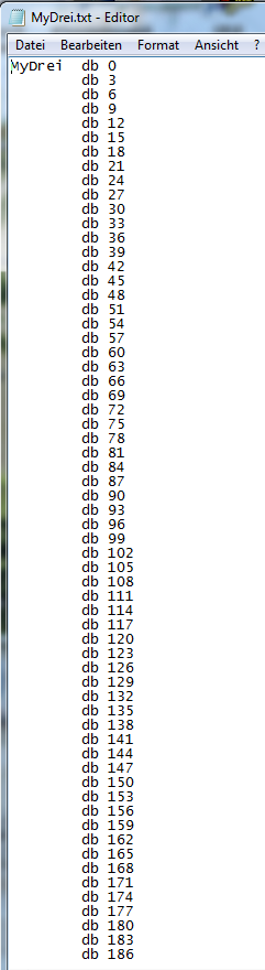 Hi, bin neu hier im Forum und hab auch gleich eine Frage. Ich bin E-Technik-Student im 4ten Semester und wir haben ein Microcomputerpraktikum. Dabei soll unter anderem folgende Funktion realisiert werden: Erstellen Sie im Datenbereich für das FLASH zwei Tabellen "MySin" und "MyDrei". Diese sollen Bytes enthalten, die eine Sinus- bzw. eine Dreiecksperiode darstellen. Dabei soll so weit wie möglich der gesamte Wertebereich verwendet werden. (0-255 +/- 2 digit). Beachten Sie des Weiteren, dass bei einer Übertragung durch die PEC Einheit maximal 254 Werte in Reihe übertragen werden können. Um dies zu erreichen können Sie den Sinus mit einer 2° Auflösung und das Dreieck mit einer Steigung von +/- 3 Digit erstellen. So weit, so gut. Für das Dreiecksignal ist eine Textdatei vorgegeben, damit man sich das vorstellen kann. Dabei beginnt diese bei 0, geht in 3er Schritten hoch bis 252 und dann das ganze wieder rückwärts. Und nun soll man sich eine Funktion erstellen, um diese Werte für den Sinus auszurechnen: Für die Berechnung der Sinus-Werte mit 2° Auflösung (0°-358°) können Sie eine Tabellenkalkulation verwenden, mit deren Hilfe sie eine Formel (y=f(x)) erstellen, die die Grad in den Wertebereich 0 bis 255 umsetzt. Da haperts aber schon.. Das ist jetzt zwar nicht speziell auf einen µC gerichtet, aber da der Versuch aus noch mehreren Teilen besteht, bei denen im Verlauf des Praktikums wieder Fragen auftreten, dachte ich, ich stelle das mal hier rein. Danke schon mal und Gruß
