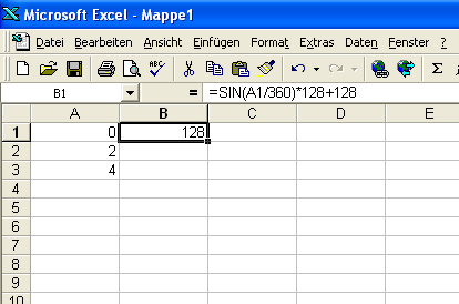 @ Steffan Farn (steff_fa) >Erstellen Sie im Datenbereich für das FLASH zwei Tabellen "MySin" und >"MyDrei". Oder vielleicht Mai Tai? https://de.wikipedia.org/wiki/Mai_Tai >Und nun soll man sich eine Funktion erstellen, um diese Werte für den >Sinus auszurechnen: >Für die Berechnung der Sinus-Werte mit 2° Auflösung (0°-358°) können Sie >eine Tabellenkalkulation verwenden, mit deren Hilfe sie eine Formel >(y=f(x)) erstellen, die die Grad in den Wertebereich 0 bis 255 umsetzt. >Da haperts aber schon.. Schlecht. Formelnutzung in Excel üben. Kleiner Tip: Siehe Anhang.