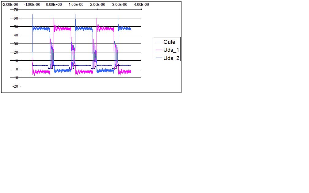 Mir ist es nur einmal passiert, als ich an der Sekundärseite einen Tastkopf dranhängte. Die Sekundärseite ist isoliert. Das Oszi geht nicht über einen Trenntrafo, es hing aber auch nichts anderes dran, als diese eine Probe. Das andere mal beim verändern der Brückenspannung. Ich habe vorher schon stundenlang mit angeschlossenem Tastkopf gemessen, ohne dass etwas passiert wäre, nur eben dieses eine Mal ging es bein Anschließen des Tastkopfs während des Betriebs kaputt. Um wieviel sollte man das Udsmax überdimensionionieren. Bei 48V habe ich halt 100V gewählt. Aus dem Oszilloskopbild sieht man, dass Spitzen bis zu etwa 65V auftreten. Außerdem habe ich die Testschaltung auf einer Lochrasterplatte aufgebaut und die parasitären Komponenten sind wahrscheinlich wesentlich größer als im fertigen Layout. Würde es etwas bringen, parallel zu den DS Stecken Snubber anzubringen? Ich halte das aber für eher kontraproduktiv, da ich ja extra einen schnellen FET mit geringem Cds gewählt habe...Das Oszi Bild oben zeigt während der Totzeit (ca. 200ns) jedenfalls ausgeprägte Schwingungen, die jedoch nicht größer als 30V werden.